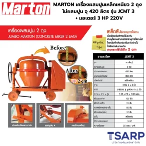 MARTON เครื่องผสมปูนเหล็กเหนียว 2 ถุง โม่ผสมปูน ความจุ 420 ลิตร รุ่น JCMT 3 +มอเตอร์ 3 HP 220V