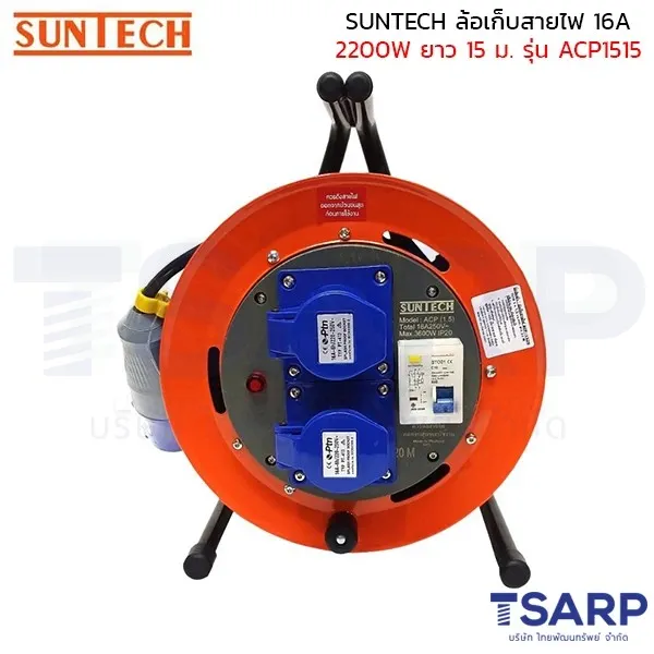 SUNTECH ล้อเก็บสายไฟ 16A 2200W สาย 3 x 1.5 sq.mm. ยาว 15 ม. เพาว์ปลั๊ก+เบรค์เกอร์ RCBO รุ่น ACP1515