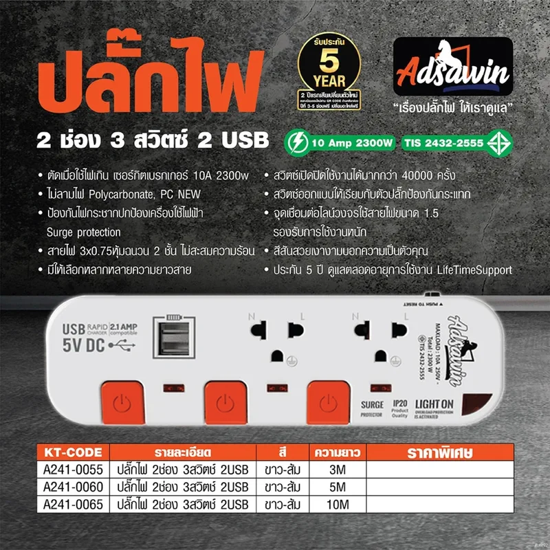 ปลั๊กไฟ รางปลั๊กไฟ ปลั๊กรางไฟ มอก. ADSAWIN By TOSHINO รุ่น