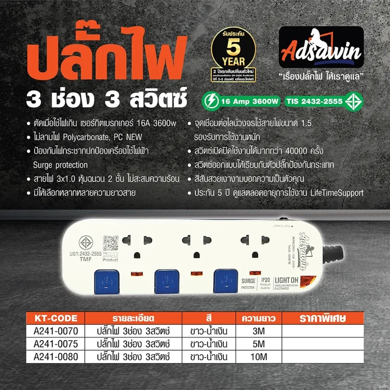 ปลั๊กไฟ รางปลั๊กไฟ ปลั๊กรางไฟ มอก. ADSAWIN By TOSHINO รุ่น
