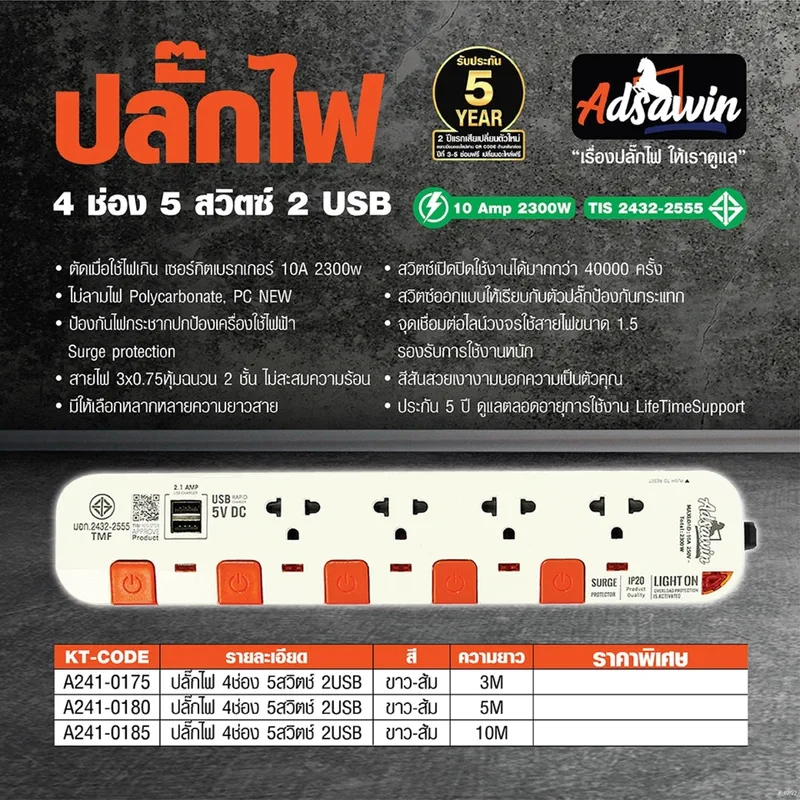 ช่องเสียบ 2 USB และ 5 สวิตซ์เปิด-ปิด 10 แอมป์ ความยาวสายไฟ 3 เมตร