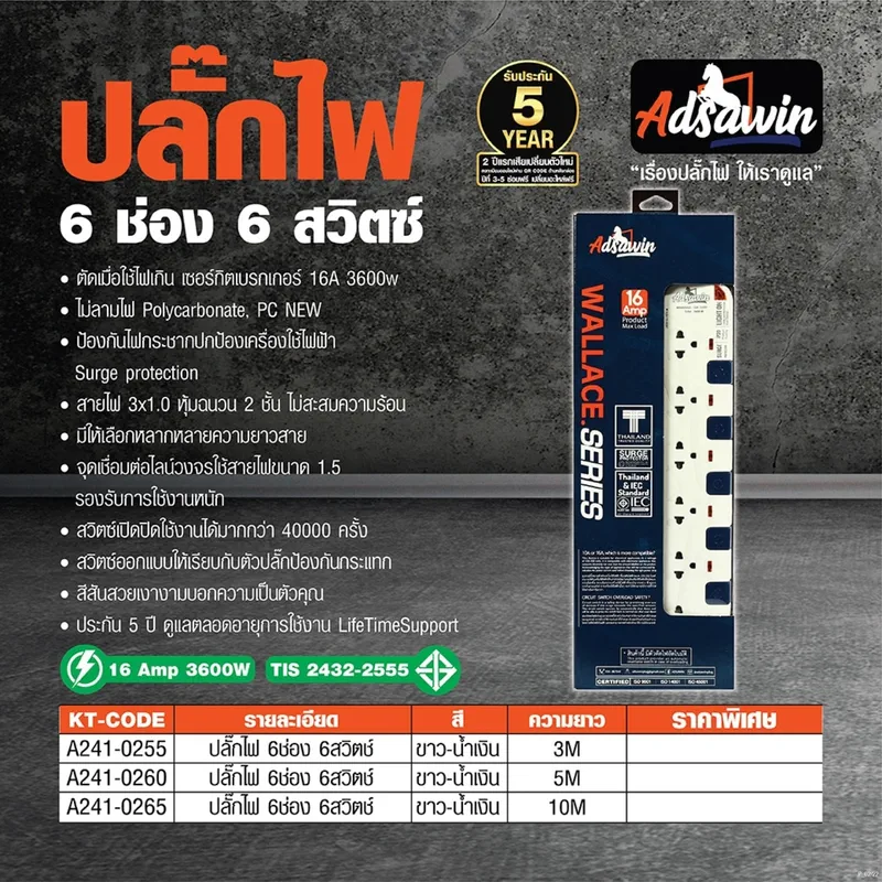 ปลั๊กไฟ รางปลั๊กไฟ ปลั๊กรางไฟ มอก. ADSAWIN By TOSHINO รุ่น WL6315-10M