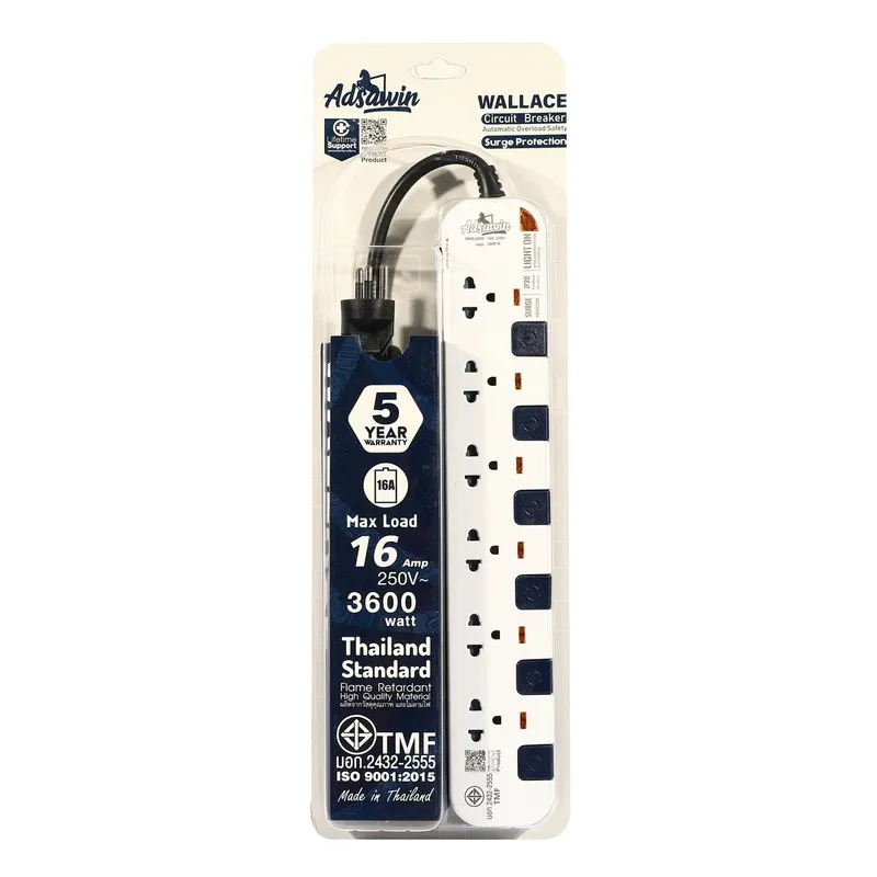 5 ช่องเสียบ 2 USB และ 6 สวิตซ์เปิด-ปิด 16 แอมป์ ความยาวสายไฟ 3 เมตร