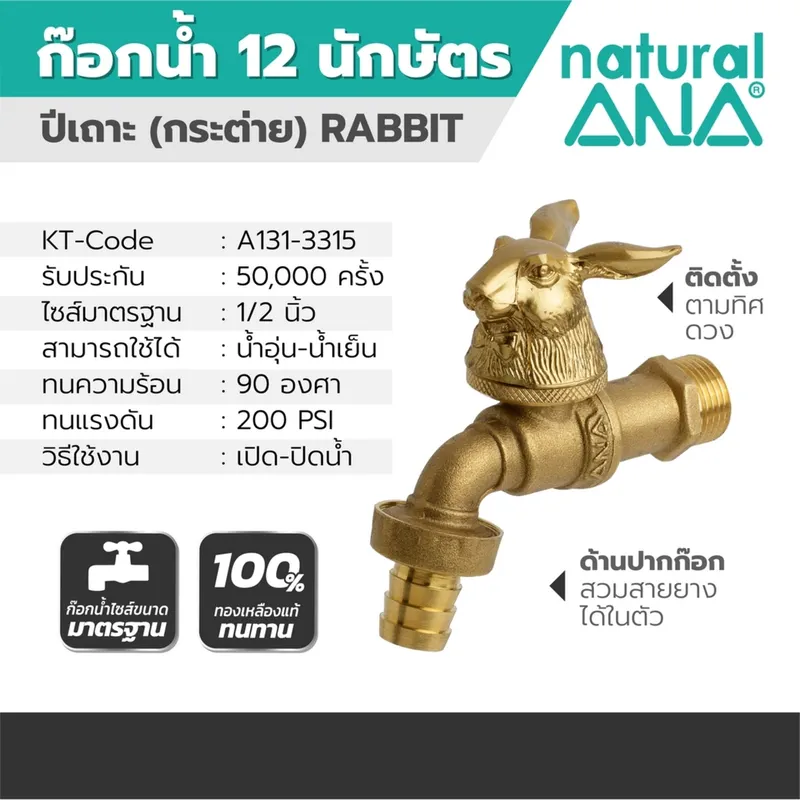 ANA ก๊อกสนาม 12 นักษัตร รุ่น 4030 (ปีเถาะ) ขนาด 1/2 นิ้ว ผลิตจากทองเหลืองแท้ 100% รับประกัน 50,000 ครั้ง เสริมดวงตามปีเกิด ติดตั้งตามทิศที่เสริมดวง