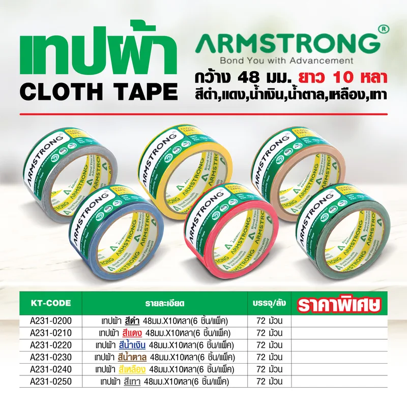 เทปผ้าสีน้ำตาล ARMSTRONG กว้าง 48 มม. ยาว 10 หลา (9 เมตร) (บรรจุ 6