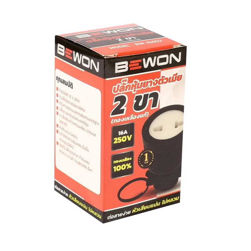 BEWON ปลั๊กหุ้มยางตัวเมีย พาวเวอร์ เสียบ 2 ขา ขนาดสินค้า : 4.2 x 5.2 cm.