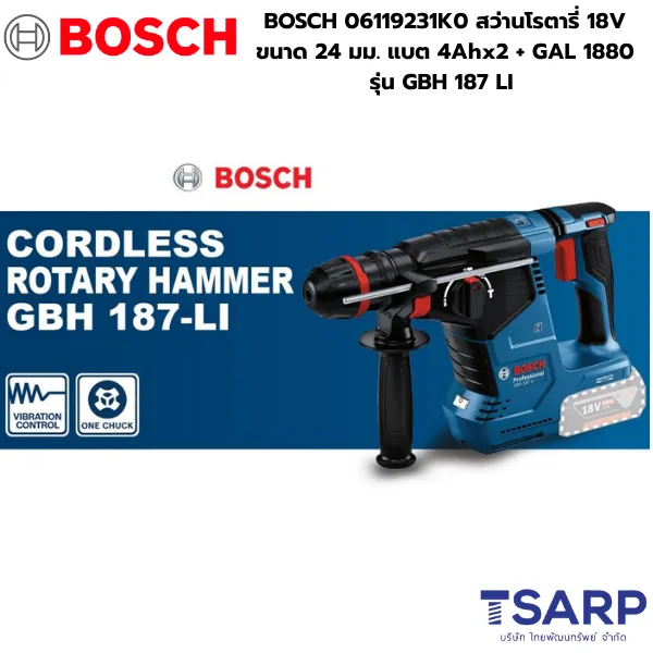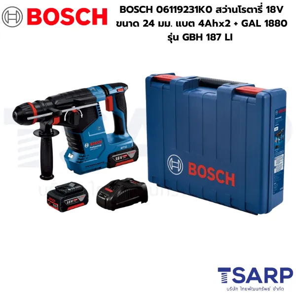 BOSCH 06119231K0 สว่านโรตารี่ไร้สาย 18V ขนาด 24 มม. แบต 4Ahx2 + แท่นชาร์จ รุ่น GBH 187 LI