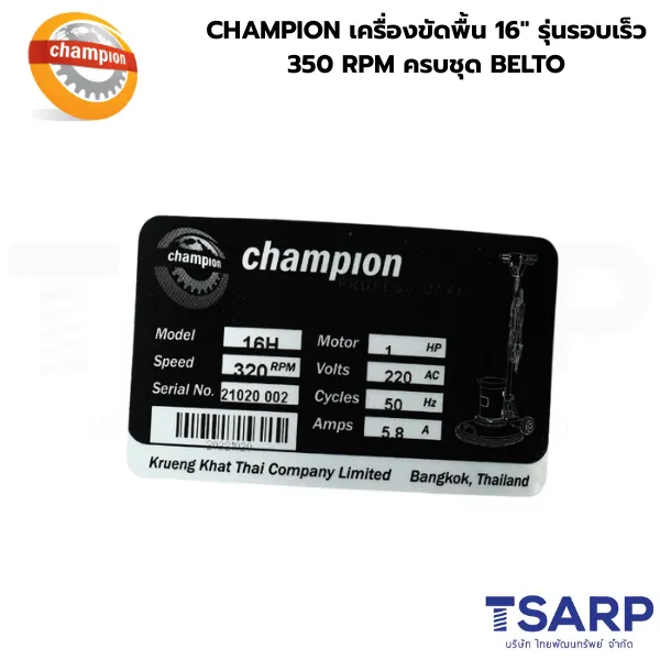 • CHAMPION เครื่องขัดพื้น 16″ รุ่นรอบเร็ว 320 RPM ครบชุด BELTO