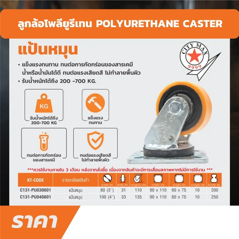 CITYMAX ลูกล้อ โพลียูรีเทน แป้นหมุน ซิตี้แม็กซ์ ขนาด 3 นิ้ว (80 มม.) รับน้ำหนักได้ 200 กก.