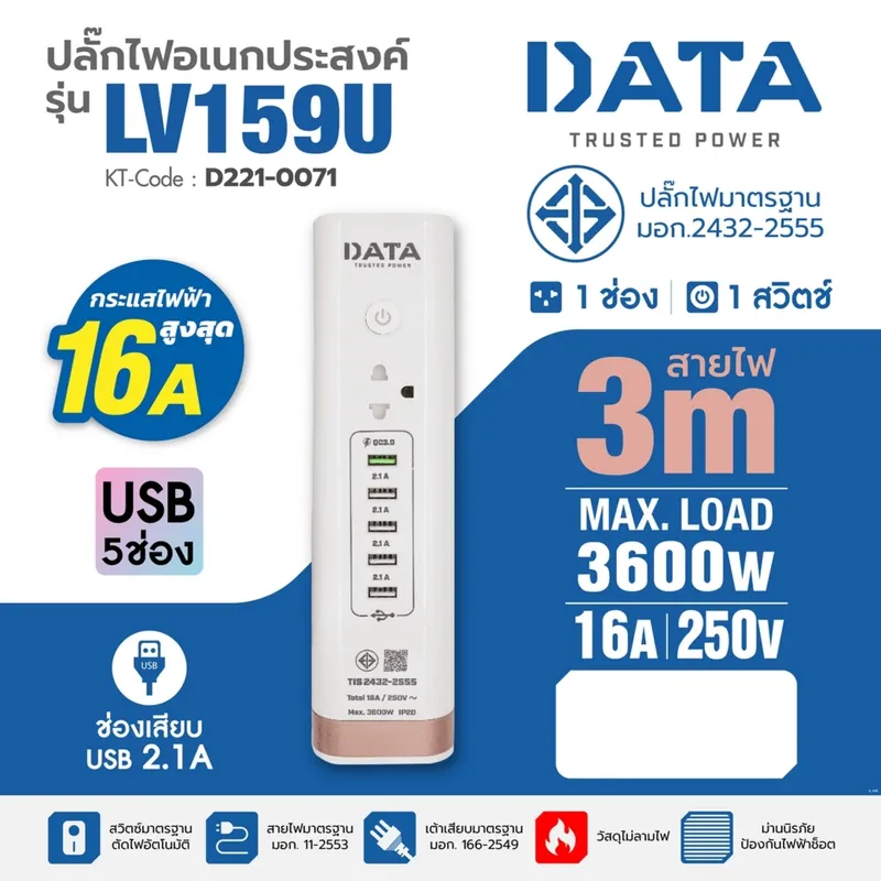 ปลั๊กไฟ 1 ช่อง 1 สวิตซ์ 5 USB ความยาวสาย 3 เมตร DATA รุ่น LV159U สีขาว