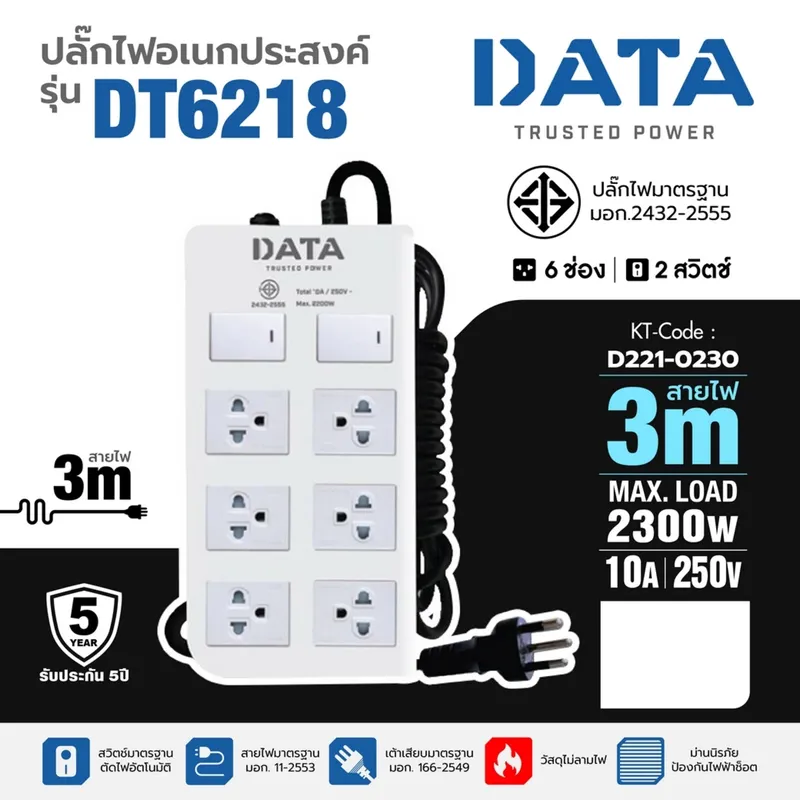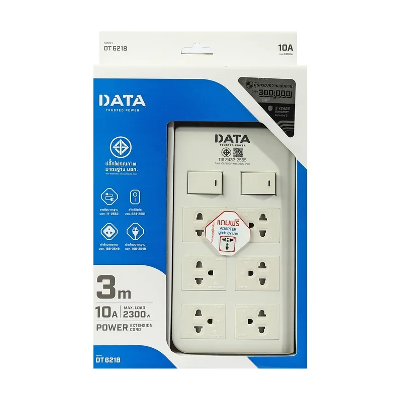 ปลั๊กไฟมาตรฐาน มอก. DATA รุ่น DT 6218 ปลั๊กไฟ 3 ตา 6 ช่อง 2 สวิตซ์ 10