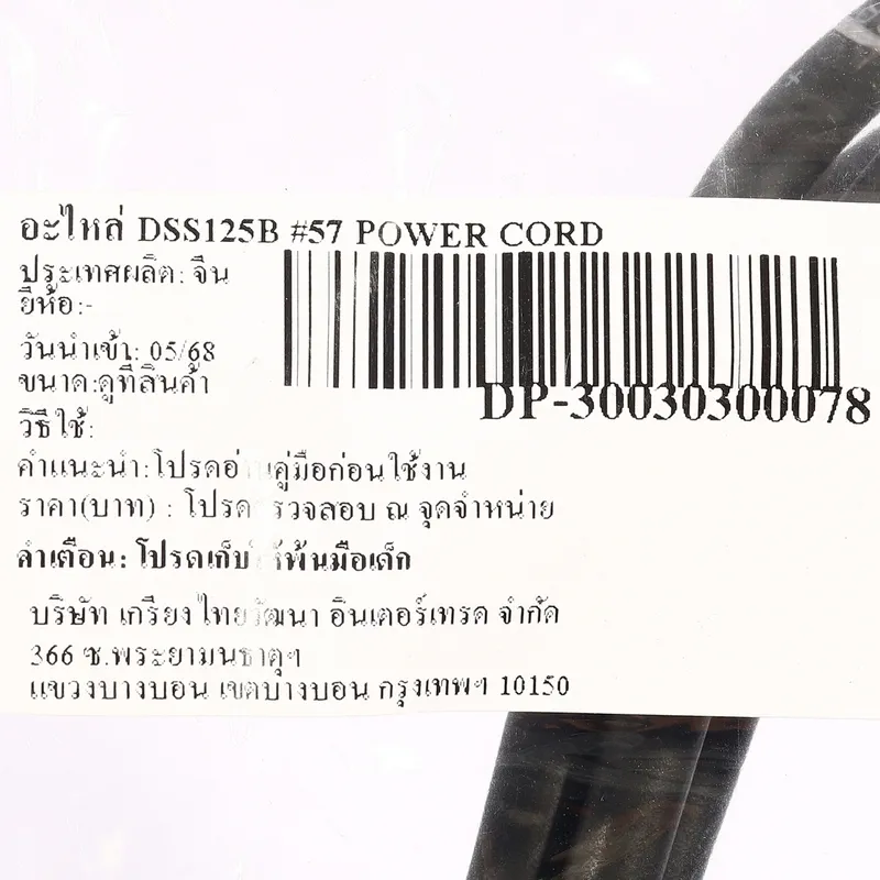 DONG CHENG อะไหล่ Power Cord (European Standard Plug) #57 ใช้กับเครื่องเครื่องเจียร์คอยาว รุ่น DSS125B (ดองเช็ง)