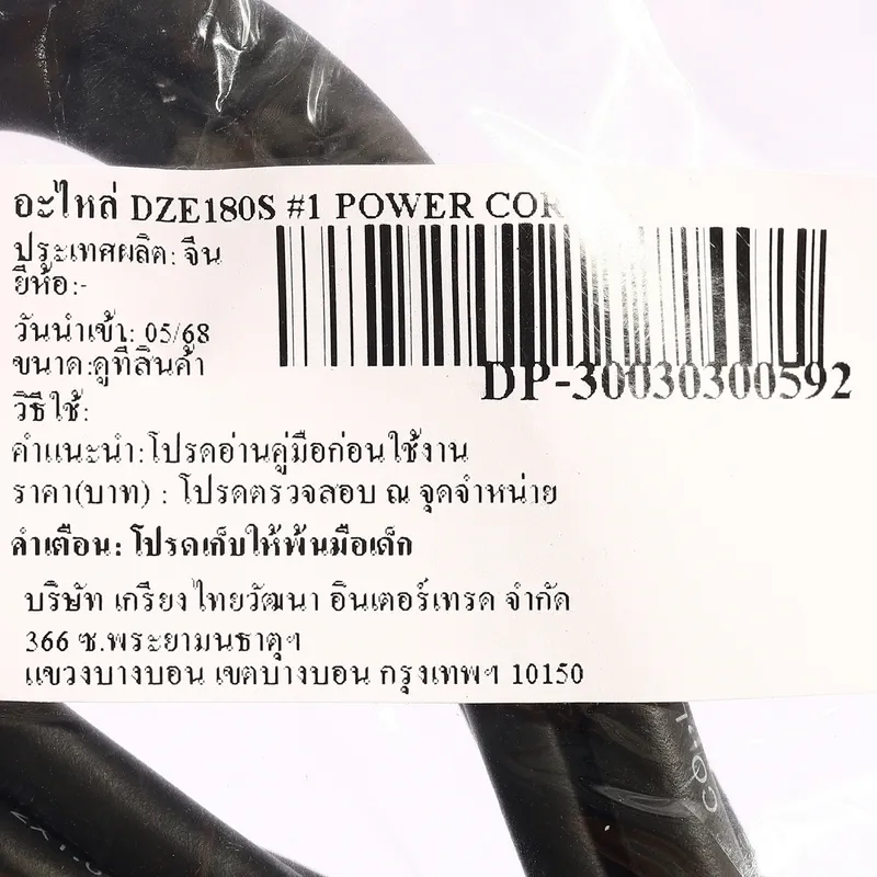 DONG CHENG Power Cord (European Standard Plug) #1 ใช้กับเครื่องเครื่องตัดน้ำ 7″ – 1900W รุ่น DZE180S (ดองเช็ง)