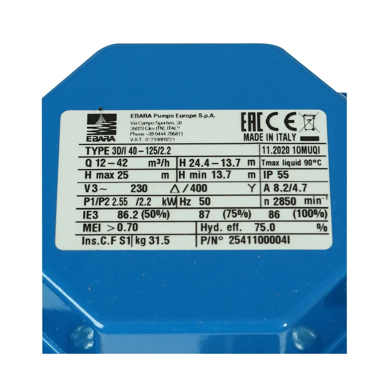 3D 40-125/2.2 ปั๊มน้ำหอยโข่งเหล็กหล่อแบบต้องใช้หน้าแปลน
