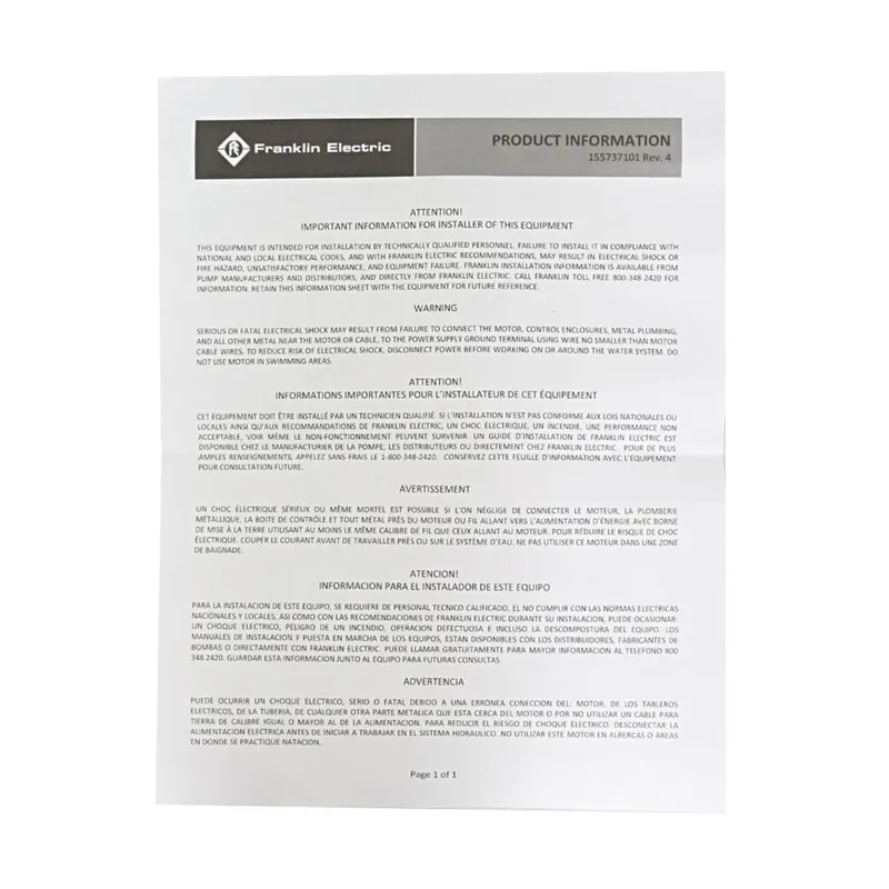 FRANKLIN มอเตอร์ 4″ 1HP 1 เฟส 220Vพร้อมสายไฟ48″