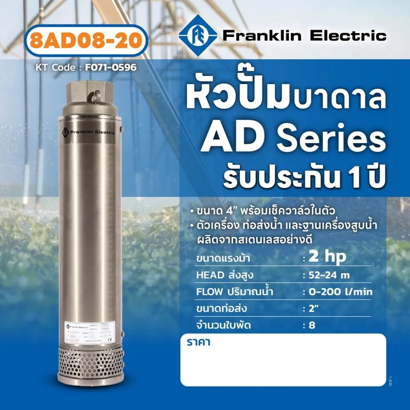 FRANKLIN 8AD08-20 ปั๊มบาดาล 4″ 2HP 8 ใบ ท่อ 2″