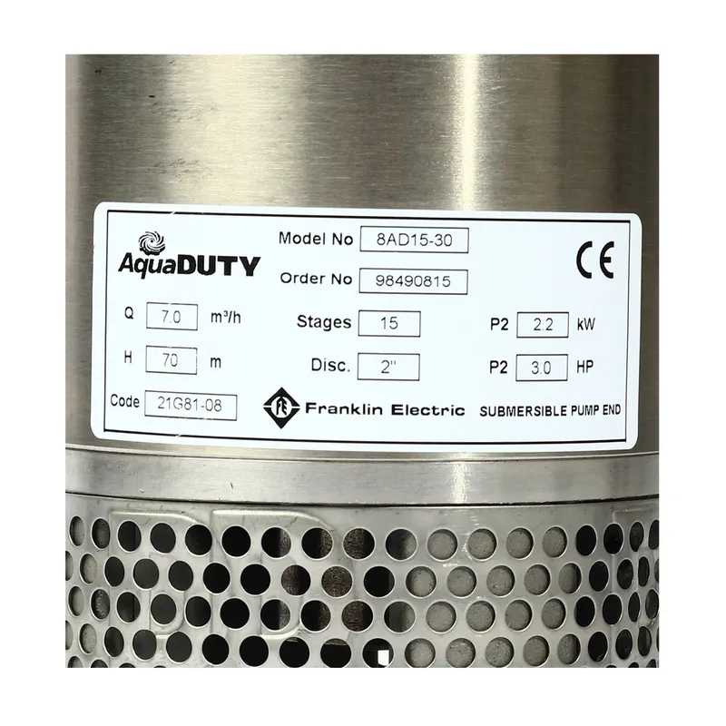 FRANKLIN เฉพาะหัวปั๊มบ่อบาดาล ขนาด 4 นิ้ว รุ่น 8AD15-30 กำลังมอเตอร์ 3 แรงม้า ท่อส่ง 2 นิ้ว ส่งสูง 70-33 เมตร ปริมาณน้ำ 120-200 ลิตร/นาที 15 ใบพัด ไม่รวมมอเตอร์ (แฟรงคลิน)