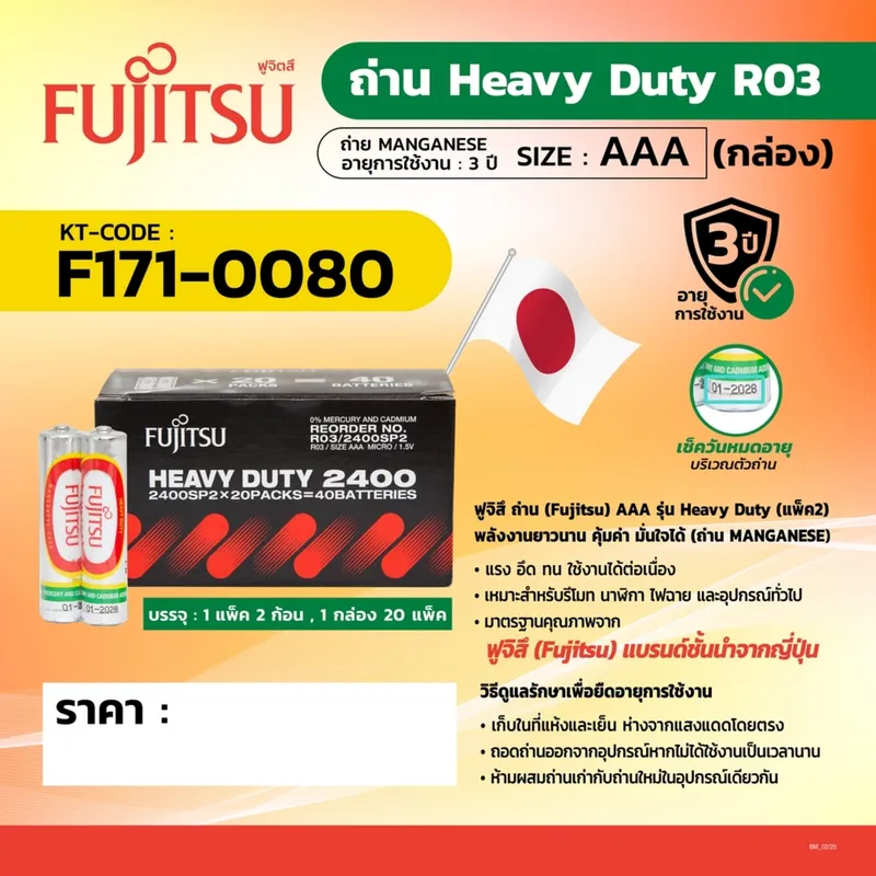 ฟูจิสึ ถ่าน (Fujitsu) AAA รุ่น Heavy Duty (แพ็ค2) R03 (1.5V / 1ก้อน)