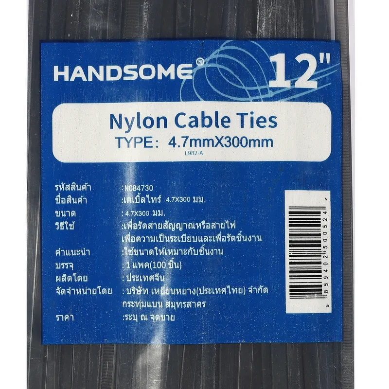 HANDSOME เคเบิ้ลไทร์ 12 นิ้ว สีดำ ขนาด 4.7 x 300 มม. รุ่น NCB4730 ใช้รัดสายไฟ Nylon Cable Tie 1 ห่อ 100 เส้น