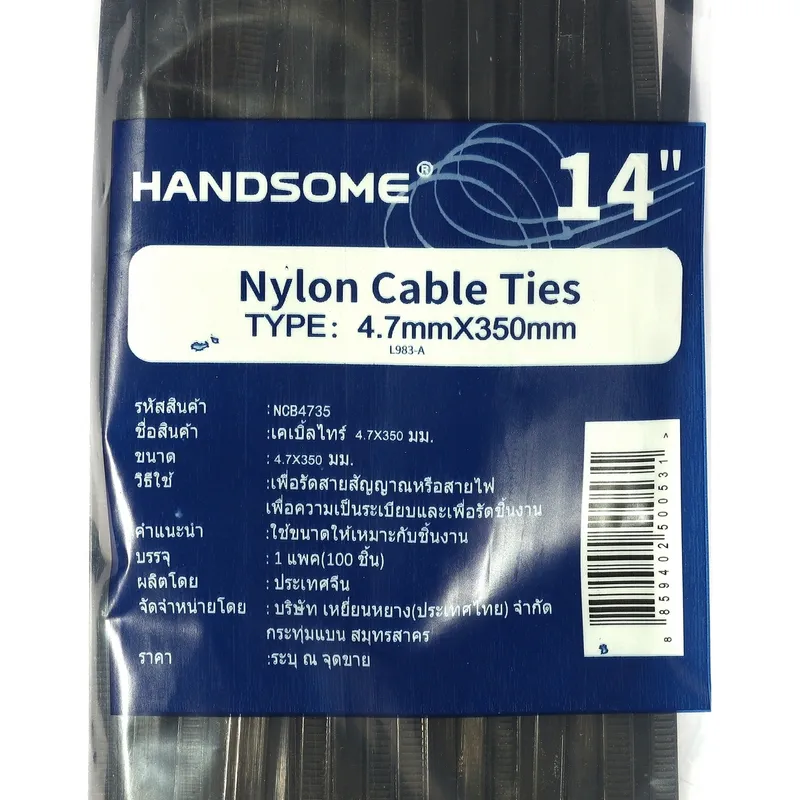 HANDSOME เคเบิ้ลไทร์ 14 นิ้ว สีดำ ขนาด 4.7 x 350 มม. รุ่น NCB4735 ใช้รัดสายไฟ Nylon Cable Tie 1 ห่อ 100 เส้น