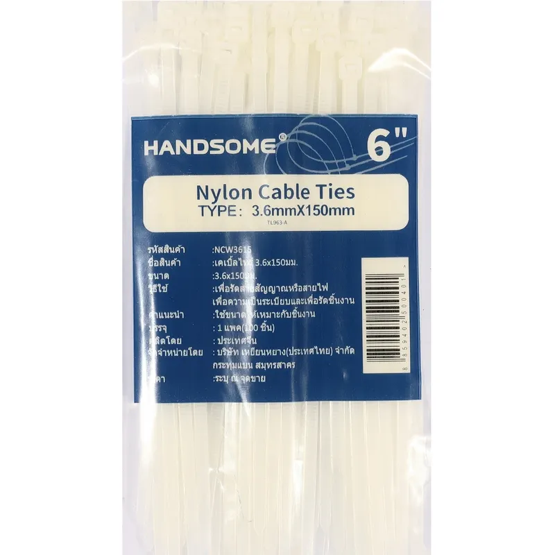 HANDSOME เคเบิ้ลไทร์ 6 นิ้ว สีขาว ขนาด 3.6 x 150 มม. รุ่น NCW3615 ใช้รัดสายไฟ Nylon Cable Tie 1 ห่อ 100 เส้น