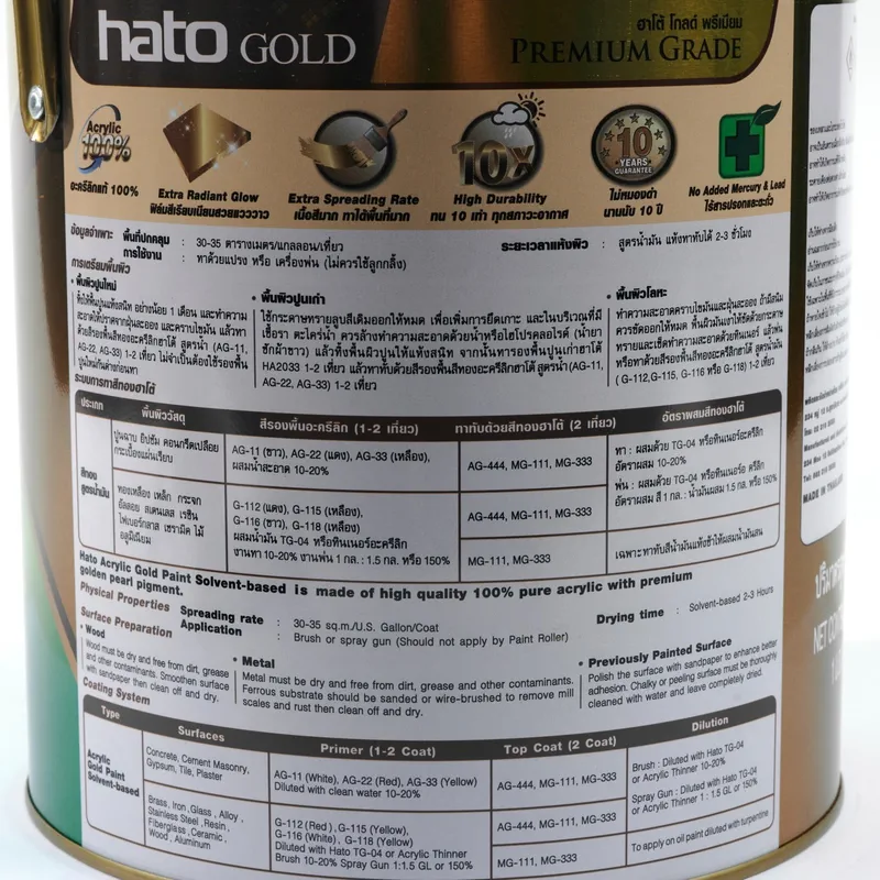 สีทองฮาโต้ (HATO) รุ่น AG-444 ผลิตจากอะครีลิคแลคเกอร์เรซินเกรดพิเศษ ผสมผสานกับผงทองนำเข้าจากยุโรป ออกแบบมาเพื่อเน้นความเงางาม (High Gloss) และการแห้งตัวที่รวดเร็ว ช่วยให้คุณประหยัดเวลาในการทำงานและลดการจับตัวของฝุ่นละอองบนผิวงาน