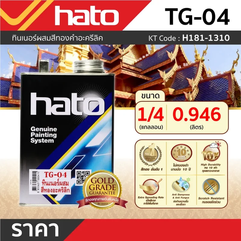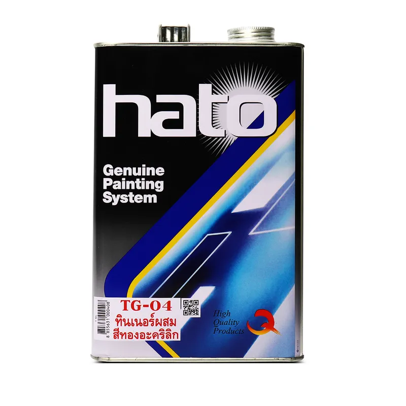 ทินเนอร์ผสมสีทองฮาโต้ รุ่น TG-04 ผลิตจากตัวทำละลายคุณภาพสูง สูตรพิเศษสำหรับสีทองคำ ช่วยปรับความเหนียวของสีให้เหมาะกับการทา และรักษาประกายทองให้สวยงาม