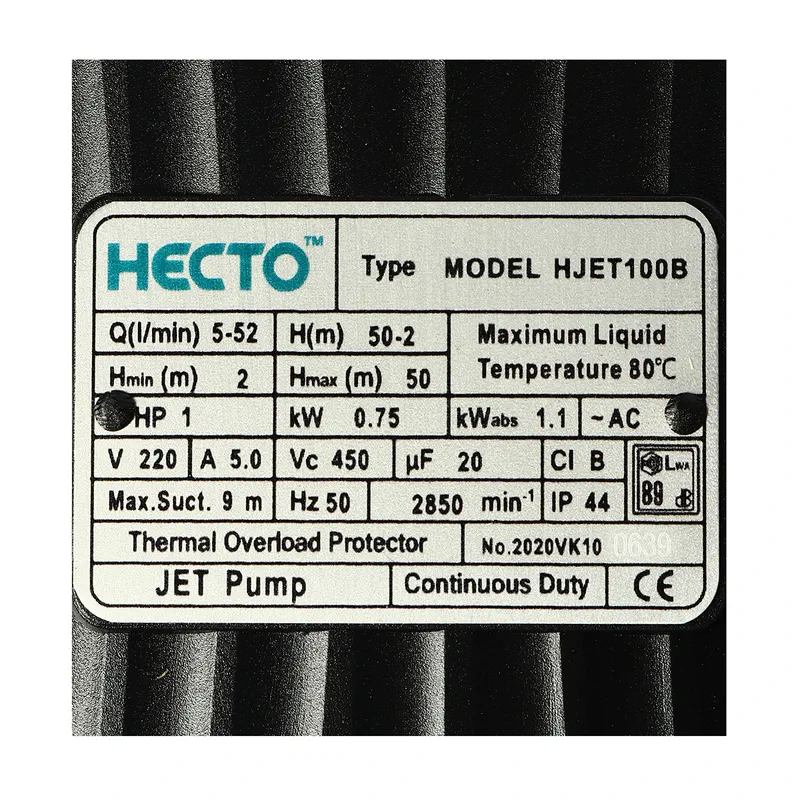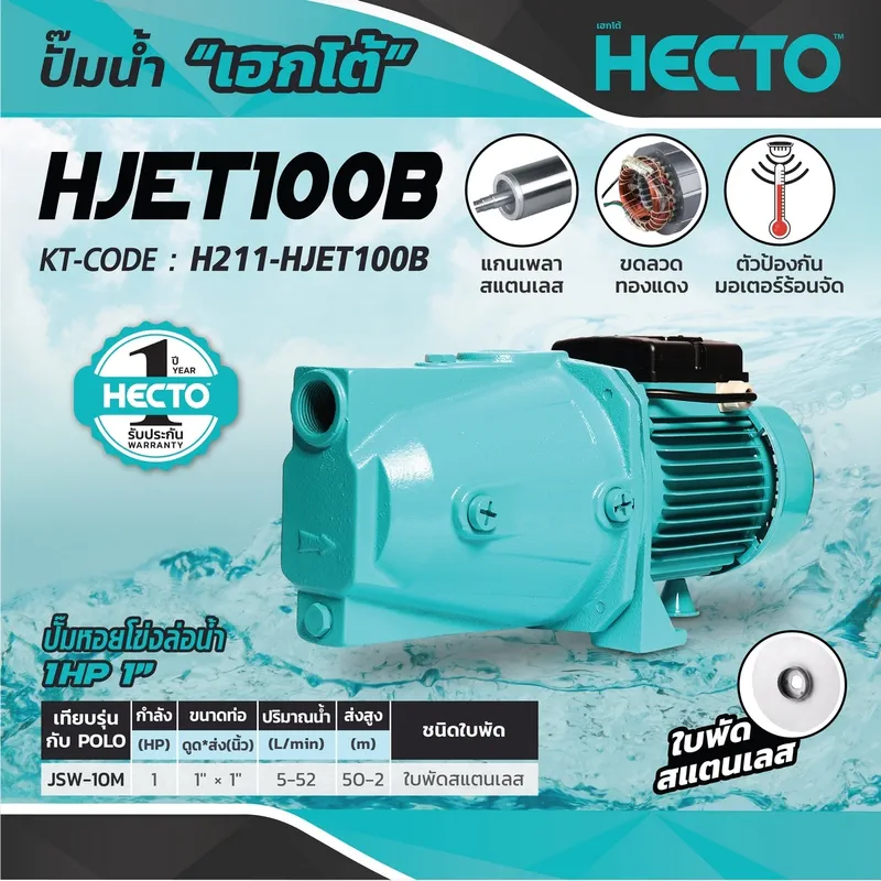 HECTO HJET100B ปั๊มหอยโข่งล่อน้ำ 1HP,1″