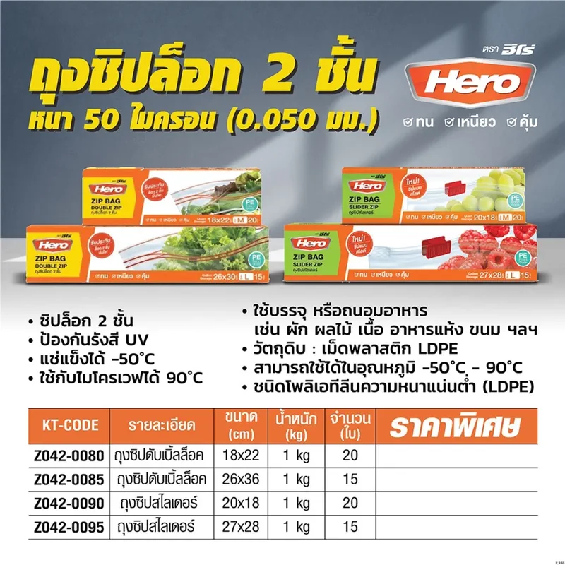 ถุงซิปล็อก 2 ชั้น HERO ขนาด 18 X 22 ซม. หนา 50 ไมครอน (0.050 มม.)