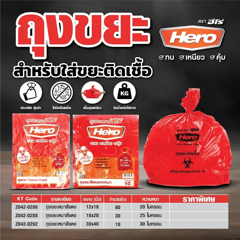 ถุงขยะหนา สีแดง HERO (ฮีโร่) รุ่น ใส่ขยะติดเชื้อแบบหนา ขนาด 18X20 นิ้ว หนา 25 ไมครอน (0.025 มม.)