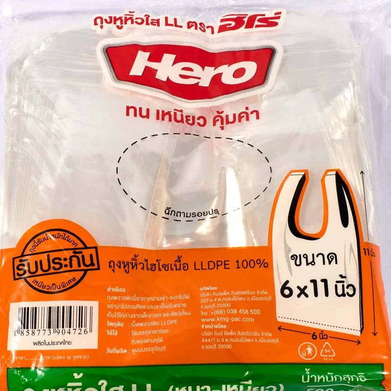 ถุงหิ้ว HERO(ฮีโร่) เนื้อพลาสติกเป็น LLDPE 100 ใสแบบหนา ขนาด 6×11″ 500G (156ใบ/แพ็ค)