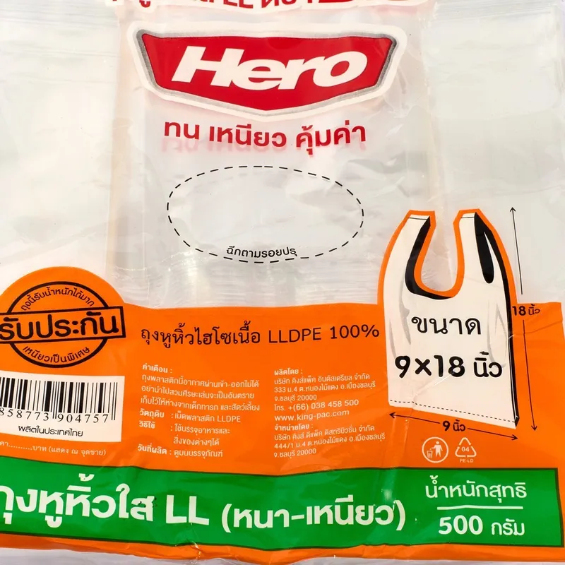 ถุงหิ้ว HERO(ฮีโร่) เนื้อพลาสติกเป็น LLDPE 100 ใสแบบหนา 30ไมครอน ขนาด 9X18″ 500G (62ใบ/แพ็ค)