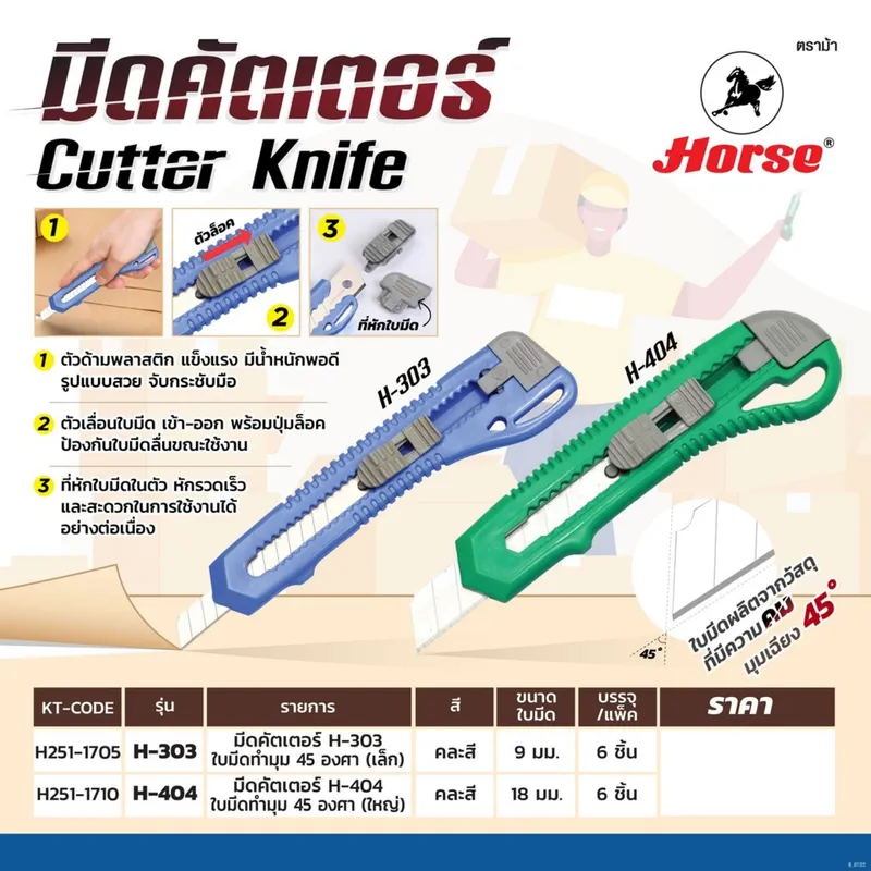 HORSE H-404 มีดคัตเตอร์ ใบมีด18 มม(6ชิ้น/แพ็ค)