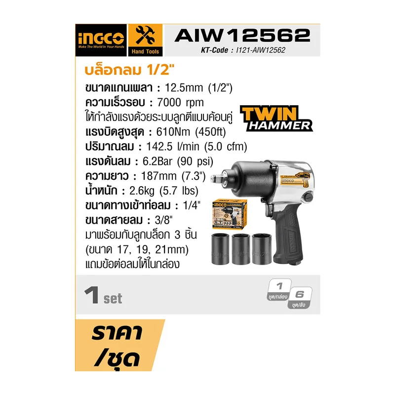 บล็อกลม ขนาด 1/2 นิ้ว INGCO รุ่น AIW12562