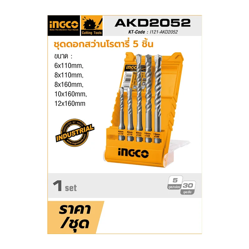 ชุดดอกสว่าน SDS PLUS 5 ชิ้น อิงโก้ (INGCO) รุ่น AKD2052 ในชุดประกอบไปด้วยดอกสว่าน SDS Plus ขนาด 6X110 มม., 8X110 มม., 8X160 มม., 10X160 มม. และ 12X160 มม.