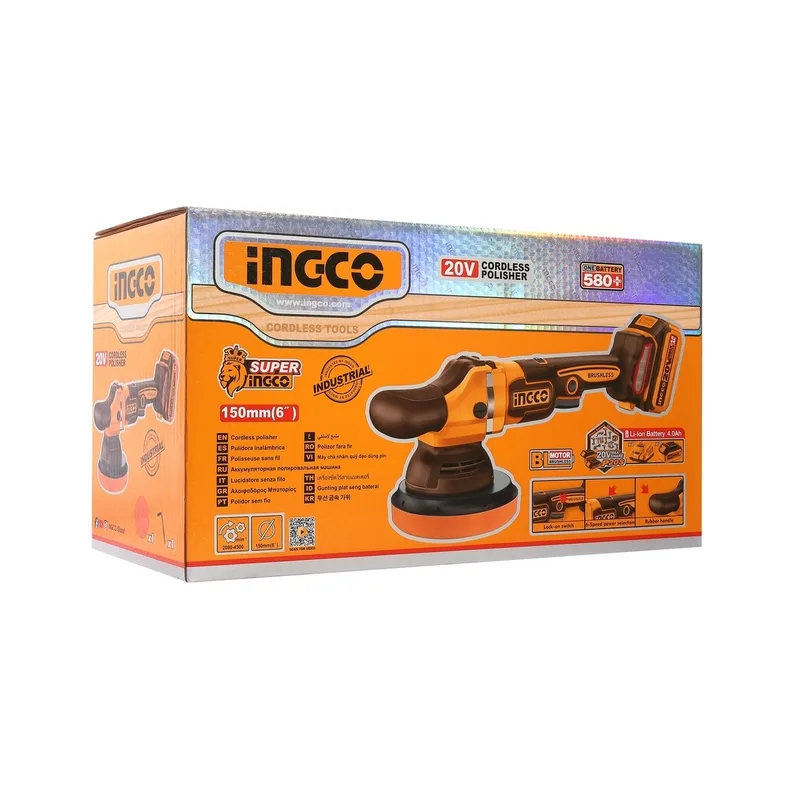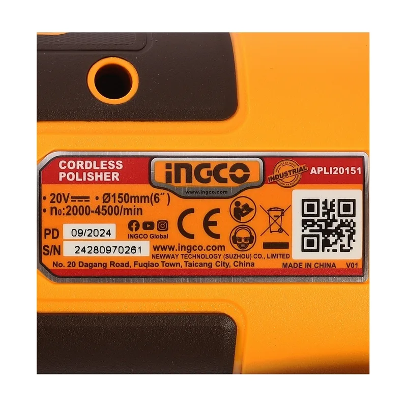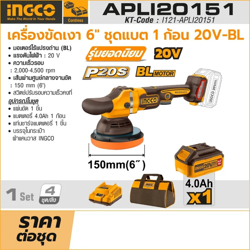 INGCO เครื่องขัดเงาไร้สาย Brushless 20V ขนาด 6″ นิ้ว พร้อมแบต 4.0Ah x1 ก้อน รุ่น APLI20151