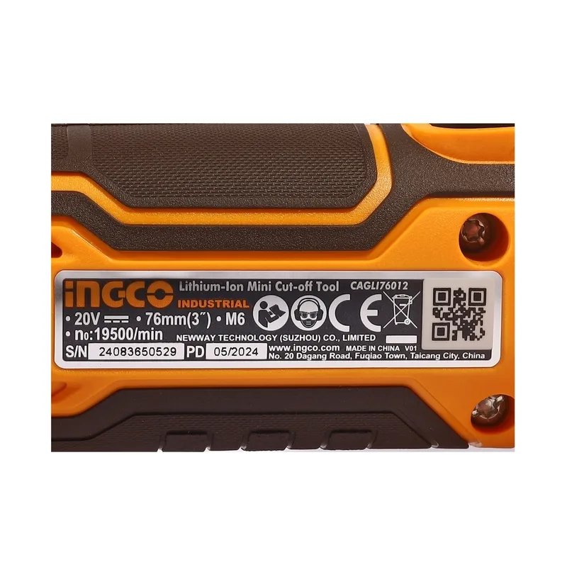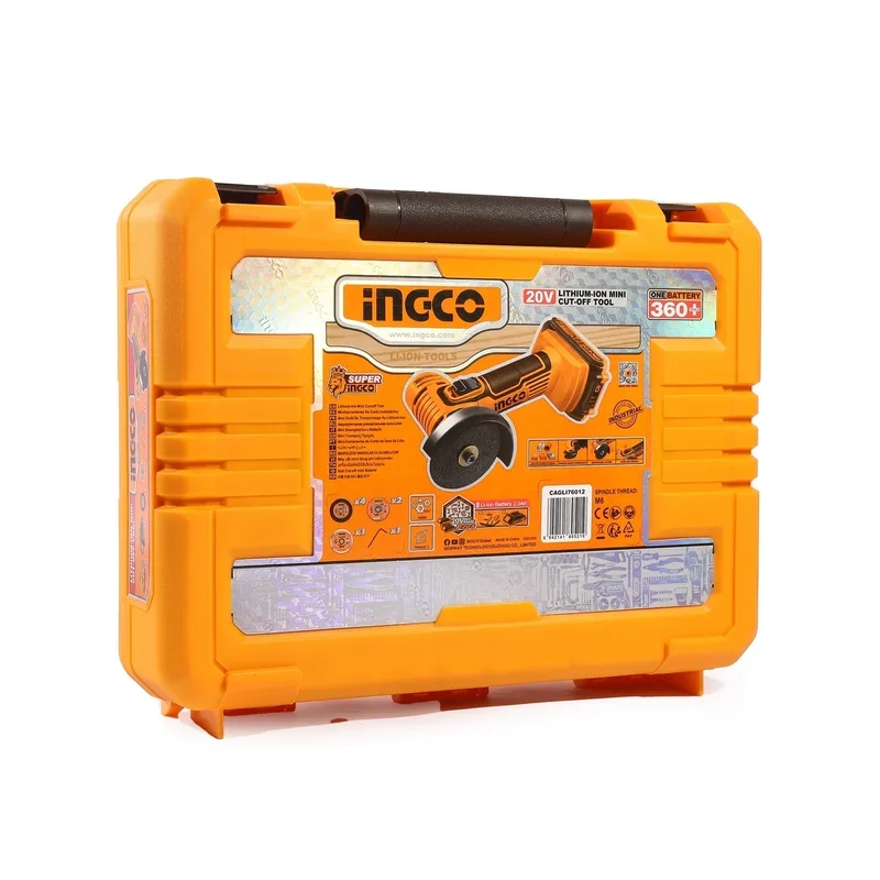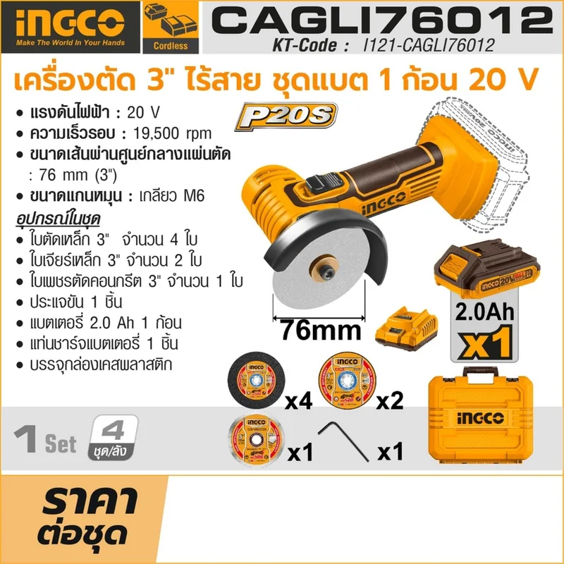 INGCO เครื่องตัดไร้สาย 20V ขนาด 3″ นิ้ว พร้อมแบต 2.0Ah x1 ก้อน รุ่น CAGLI76012