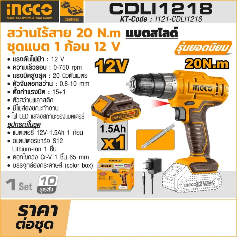 INGCO สว่านไร้สาย 12V สไลด์ แรงขัน 20 N.m พร้อมแบต 1.5Ah x1 ก้อน รุ่น CDLI1218