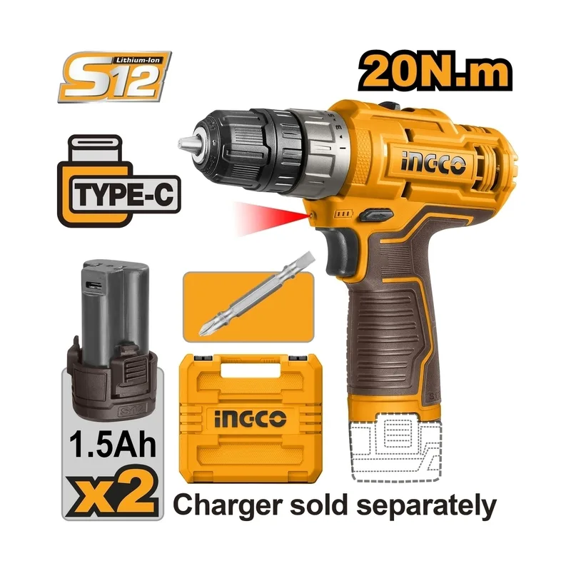 INGCO สว่านไร้สาย 12V กระบอก แรงขัน 20 N.m พร้อมแบต 1.5Ah x2 ก้อน รุ่น CDLI12206