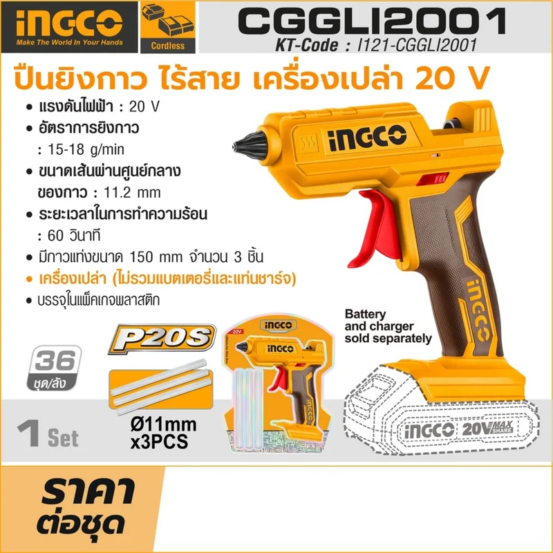 INGCO ปืนยิงกาวไร้สาย 20V (Body Only) รุ่น CGGLI2001