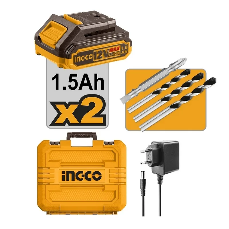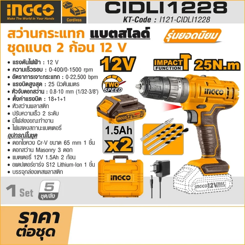 INGCO สว่านกระแทกไร้สาย 12V สไลด์ แรงขัน 25 N.m พร้อมแบต 1.5Ah x2 ก้อน รุ่น CIDLI1228