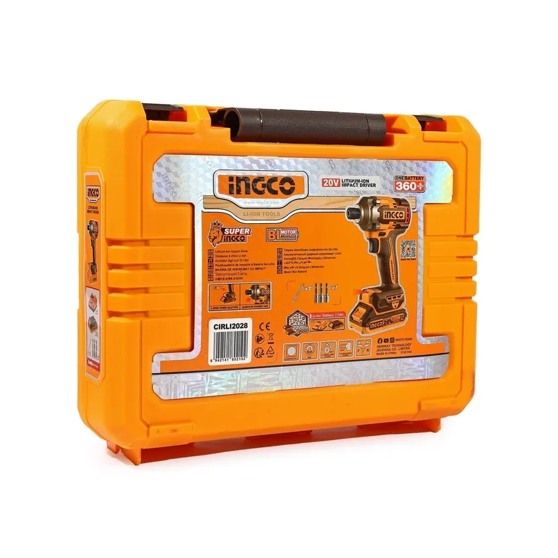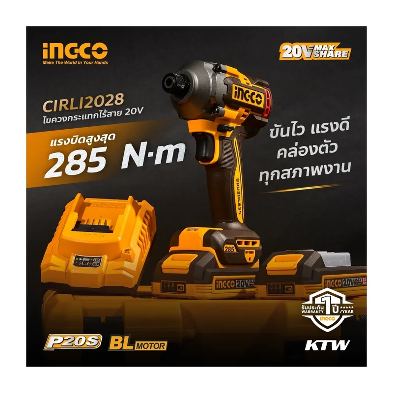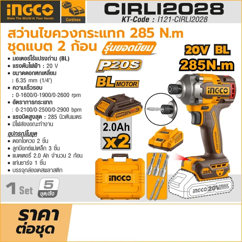 INGCO สว่านไขควงกระแทกไร้สาย Brushless 20V แรงขัน 285 N.m พร้อมแบต 2.0Ah x2 ก้อน รุ่น CIRLI2028
