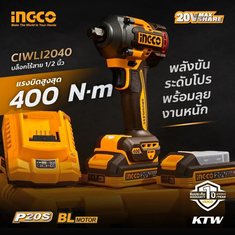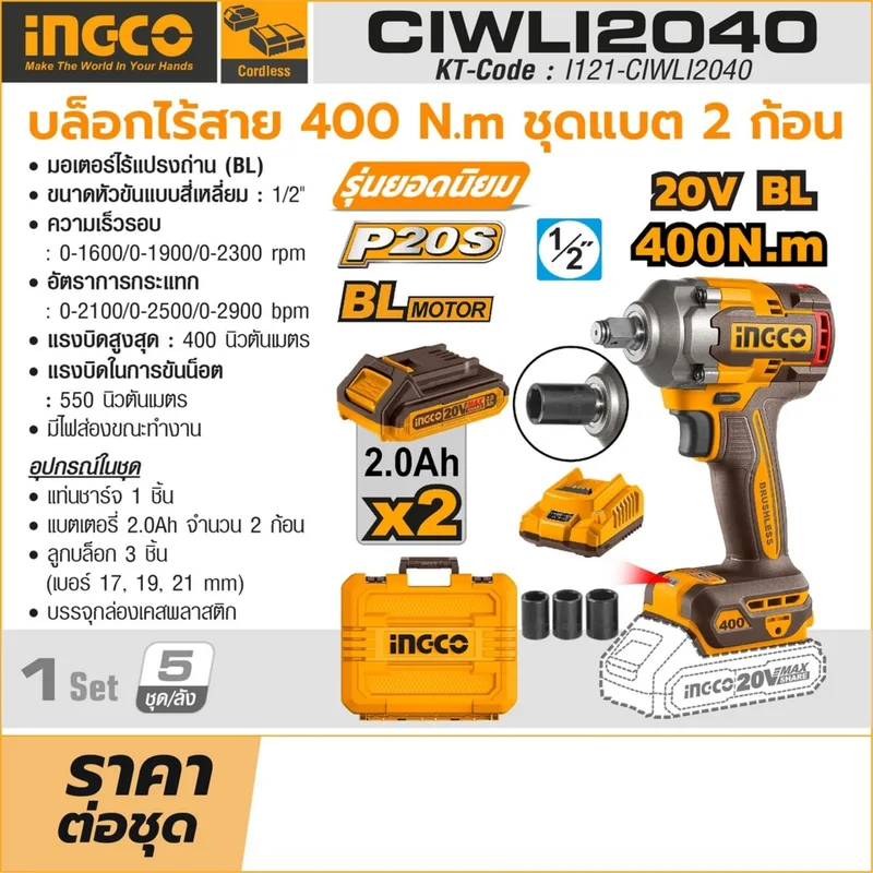 INGCO บล็อกไร้สาย Brushless 20V แรงขัน 400 N.m พร้อมแบต 2.0Ah x2 ก้อน รุ่น CIWLI2040
