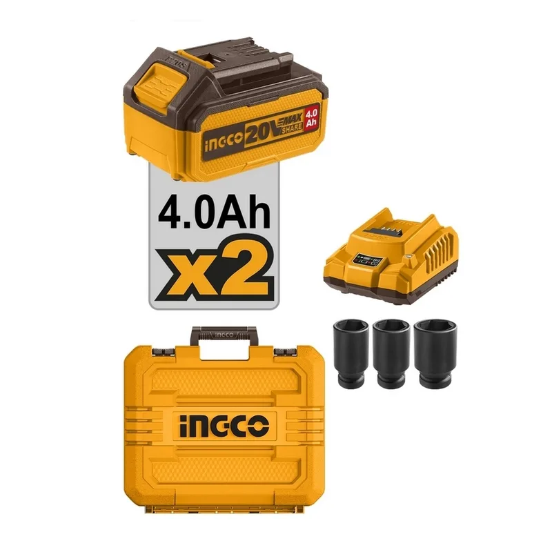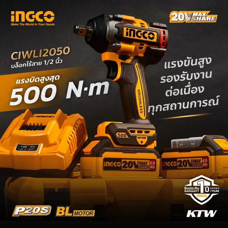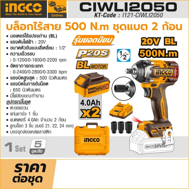 INGCO บล็อกไร้สาย Brushless 20V แรงขัน 500 N.m พร้อมแบต 4.0Ah x2 ก้อน รุ่น CIWLI2050