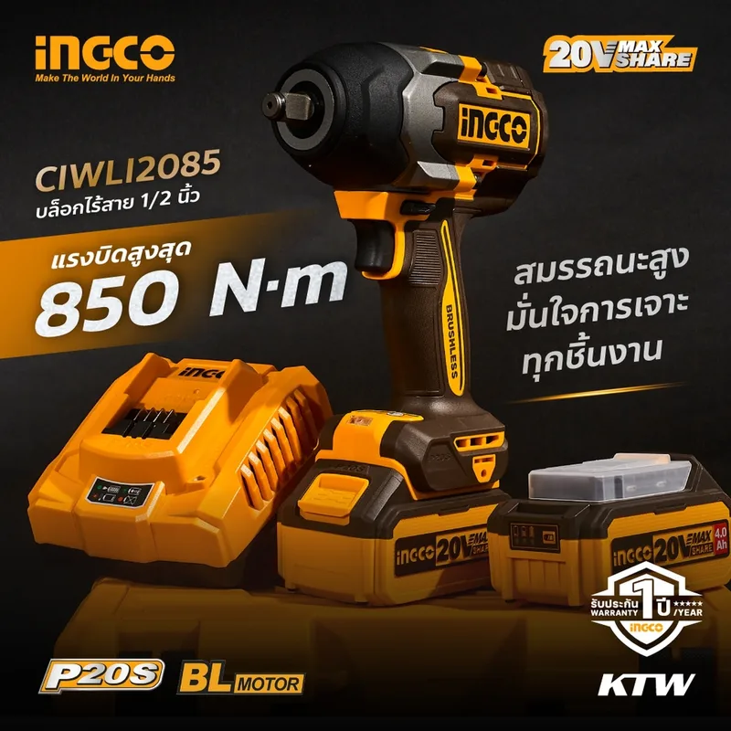 บล็อกไร้สาย 20 โวลต์ ขนาด 1/2 นิ้ว INGCO รุ่น CIWLI20851 (ไม่รวมแบตเตอรี่และแท่นชาร์จ)
