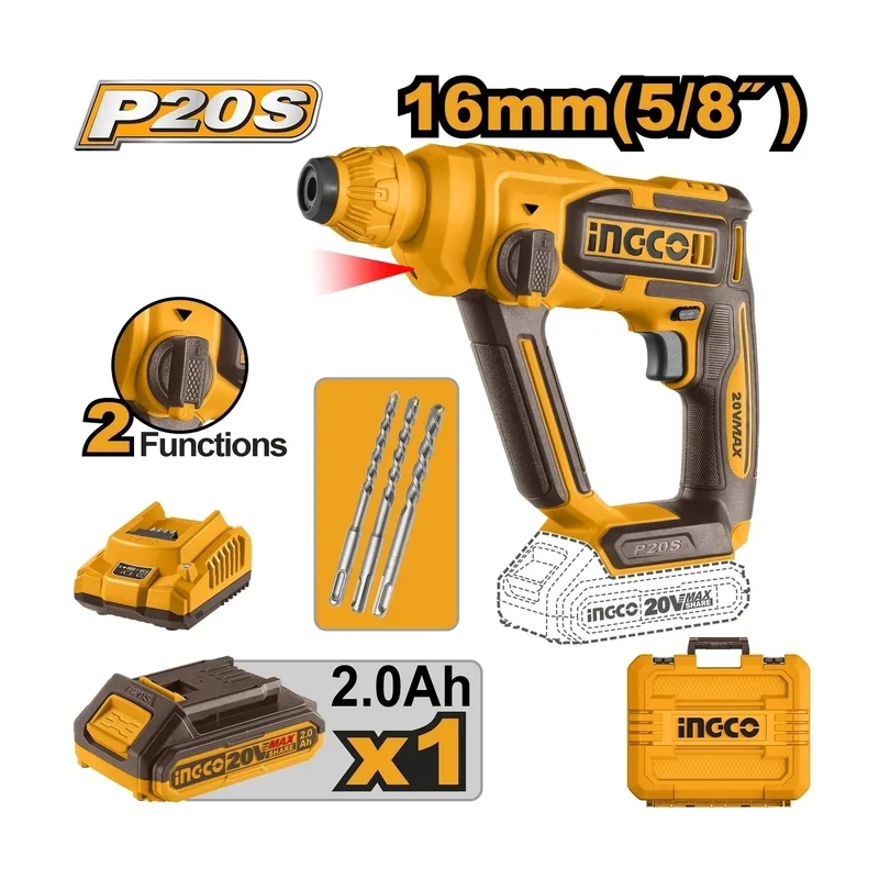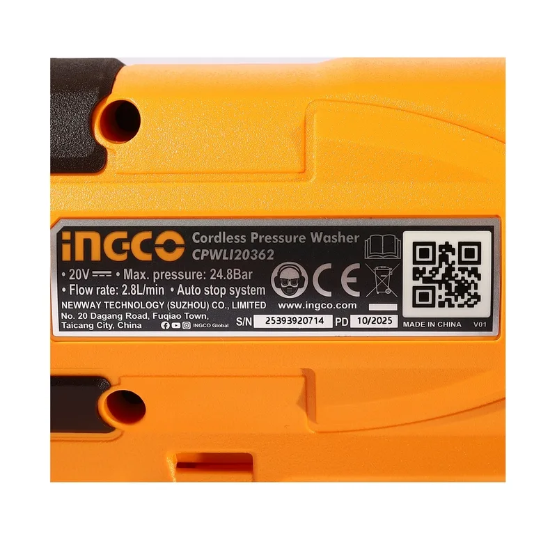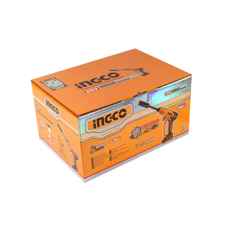 ปืนฉีดน้ำแรงดันสูงไร้สาย 20 โวลต์ INGCO รุ่น CPWLI20362 พร้อมชุดแบต 2.0AH และแท่นชาร์จ