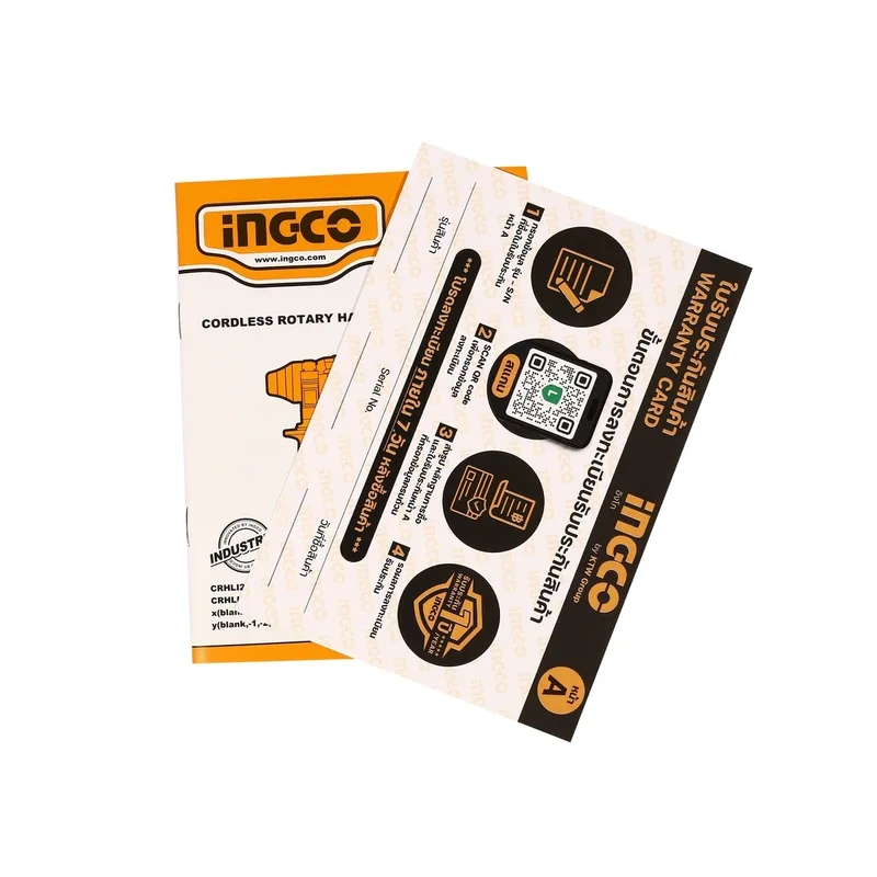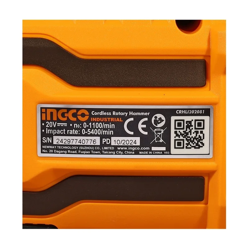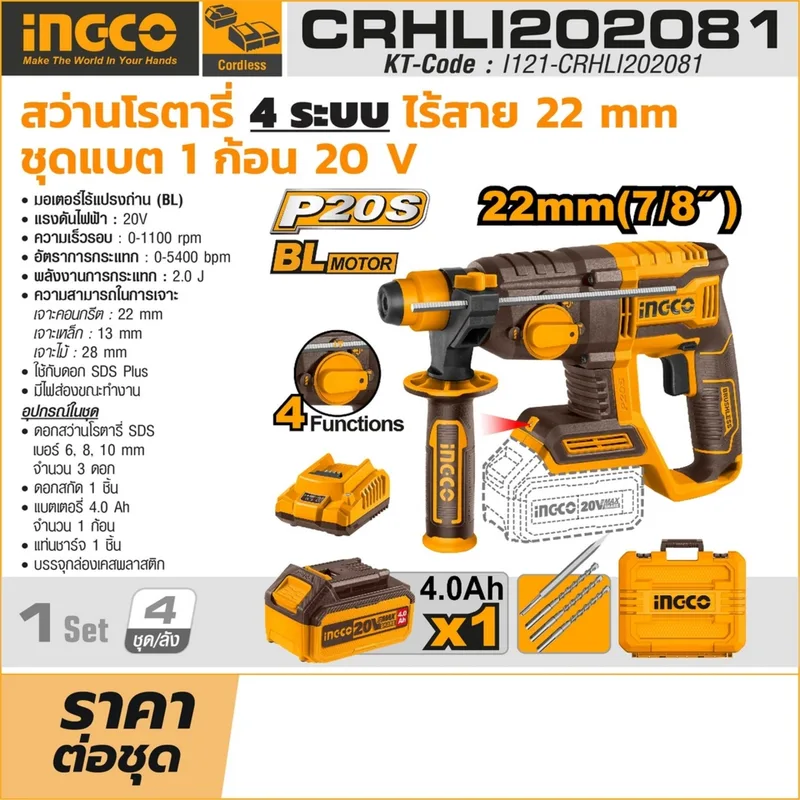 INGCO สว่านโรตารี่ไร้สาย Brushless 20V ขนาด 22 มม. พร้อมแบต 4.0Ah x1 ก้อน รุ่น CRHLI202081