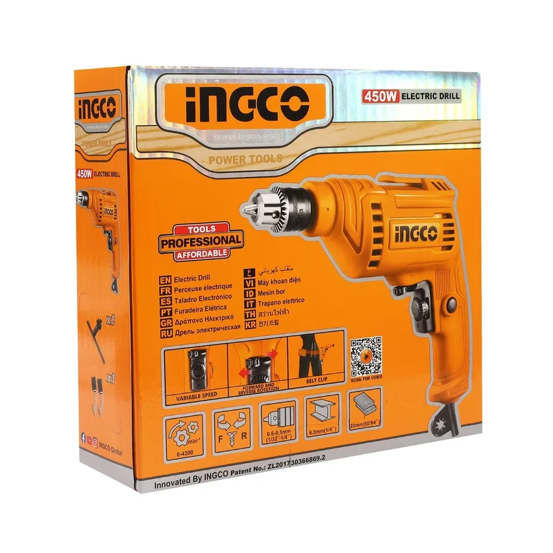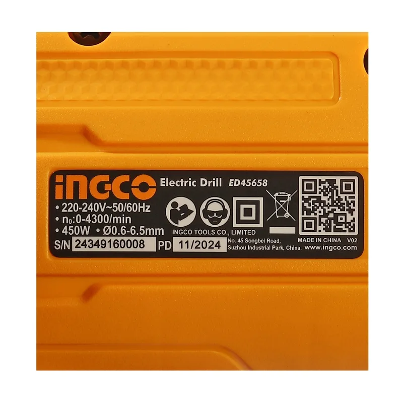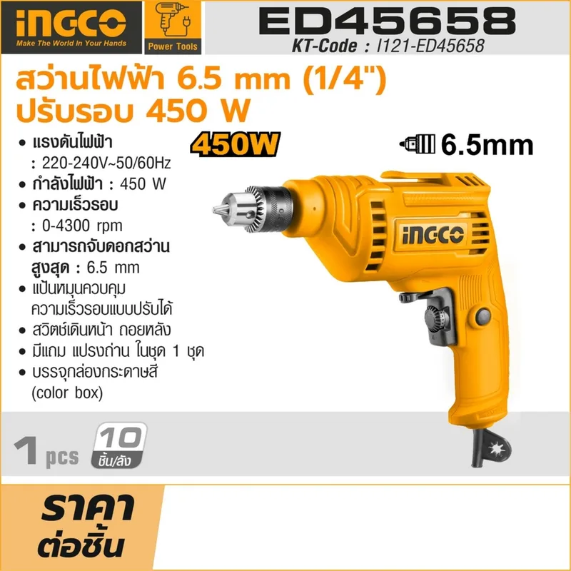 INGCO สว่านไฟฟ้า ขนาด 6.5 มม. กำลัง 450 W ปรับรอบได้ รุ่น ED45658