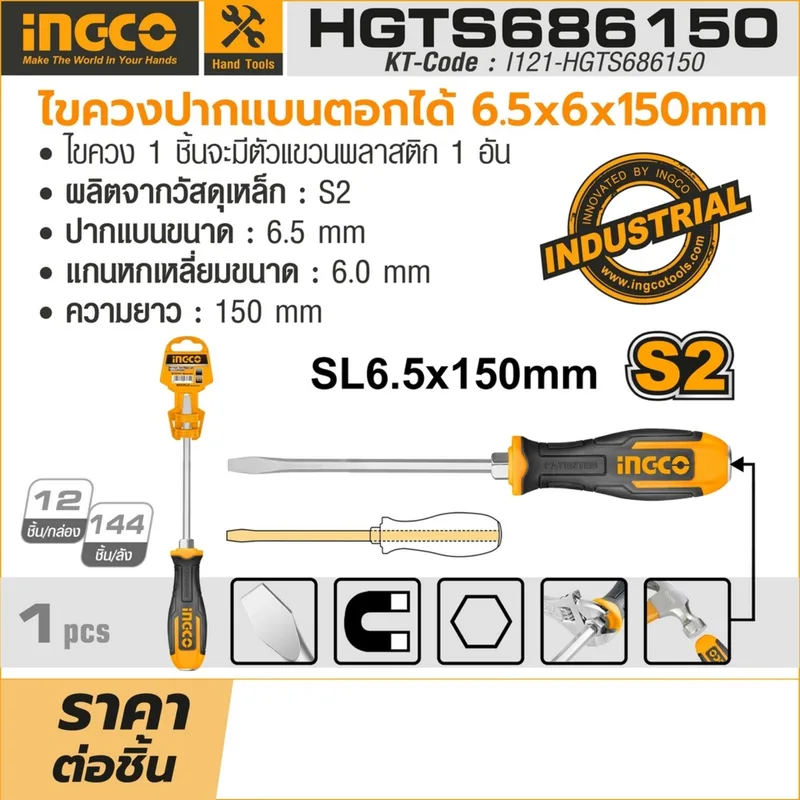 INGCO ไขควงปากแบน ตอกได้ ขนาด 6.5×6×150 มม. เหล็ก S2 รุ่น HGTS686150