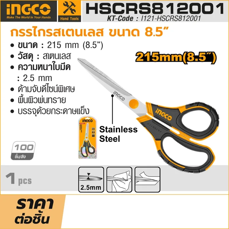 INGCO กรรไกรสเตนเลส 215 มม. (8.5 นิ้ว) รุ่น HSCRS812001 ความหนาใบมีด 2.5 มม. ด้ามจับดีไซน์พิเศษ (อิงโก้)
